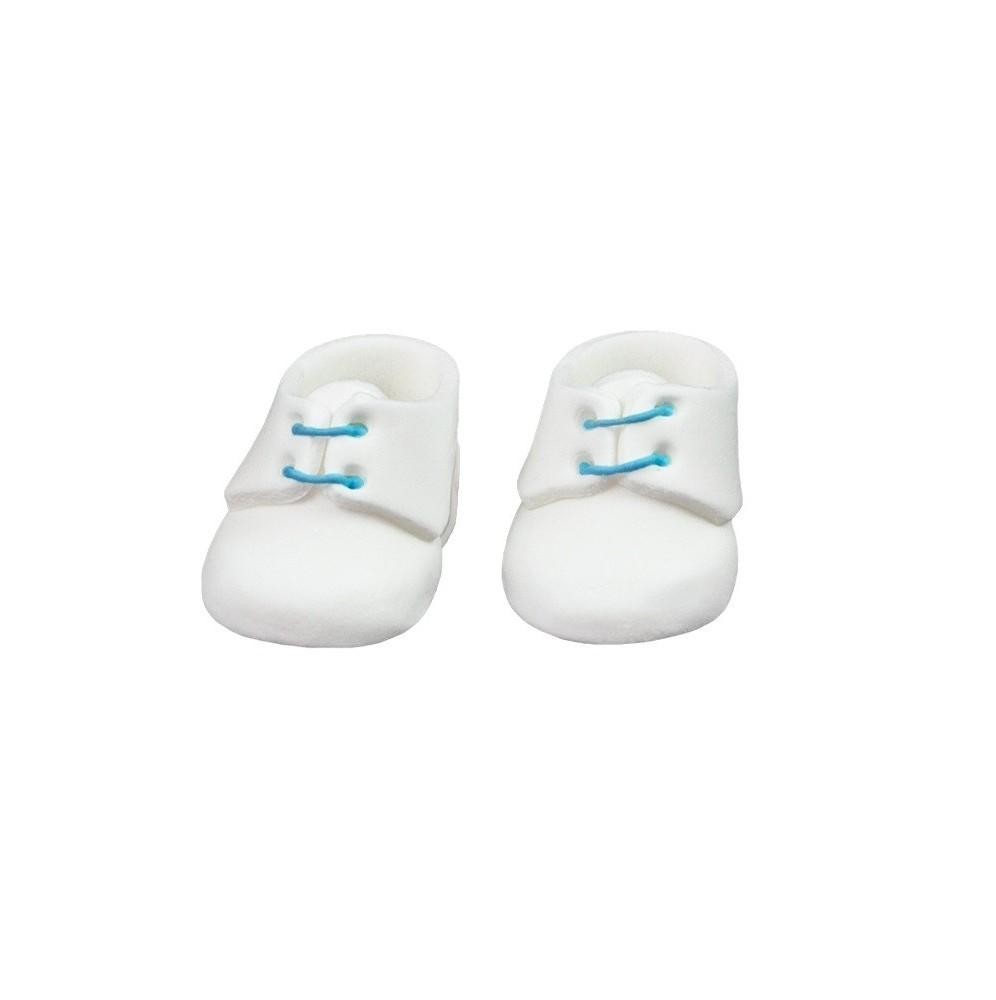 Piękna niebiesko-biała para bucików na chrzest dla chłopca wykonana z masy cukrowej.