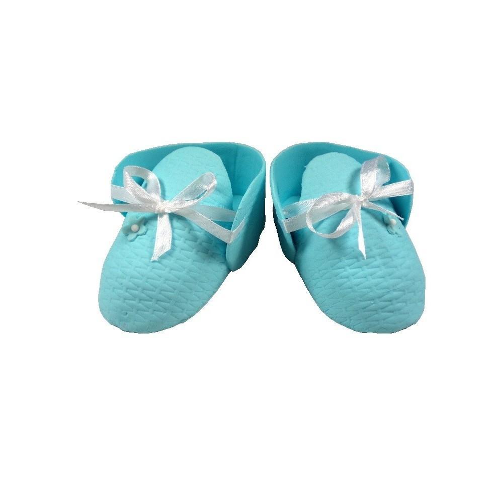 Piękna para bucików z cukru dla chłopczyka na tort z okazji chrztu. Ozdoba zawiera elementy nie do spożycia. Rozmiary jednego bucika: długość bucika 11cm, wysokość bucika 4,5cm.