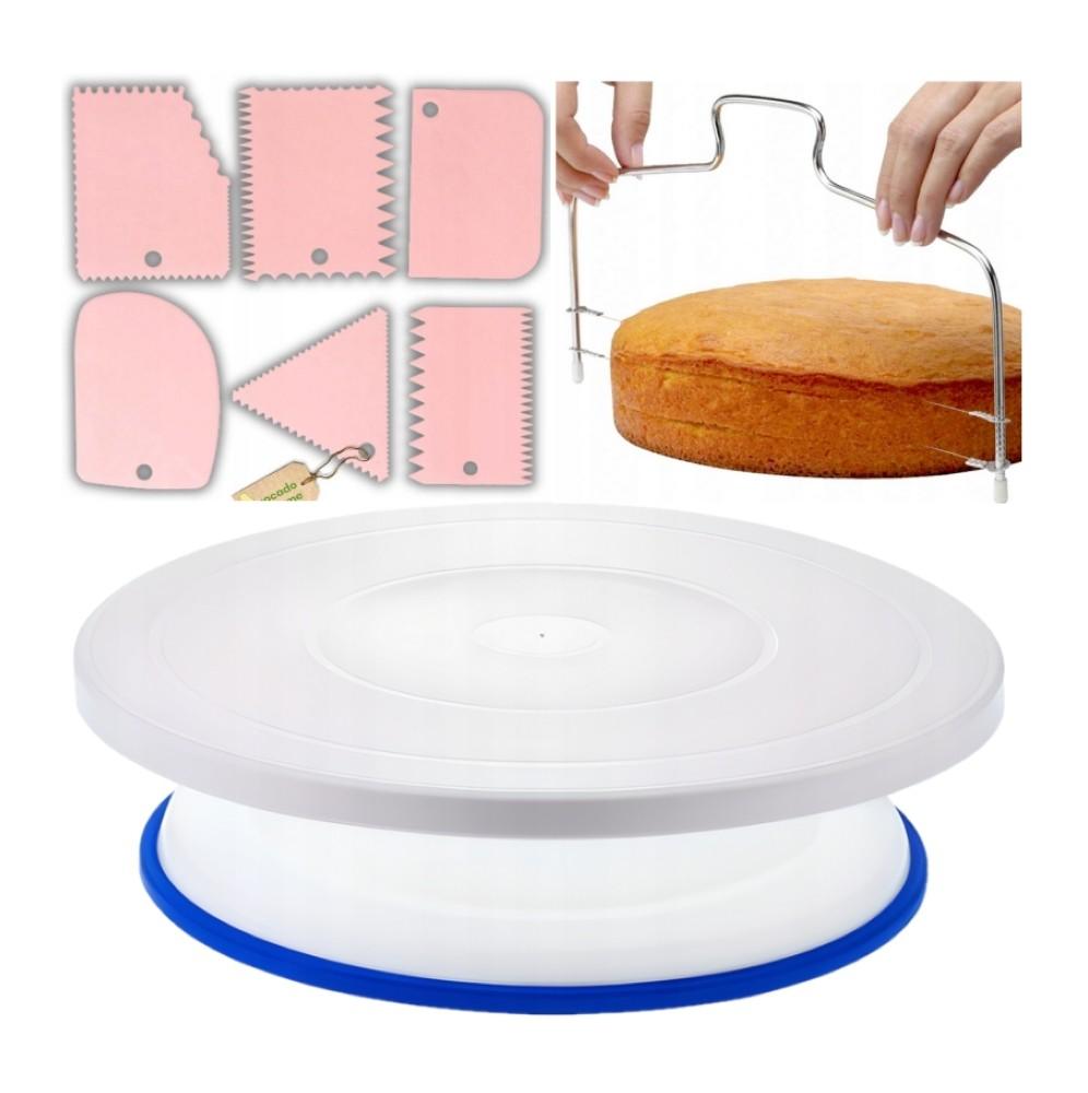 -Talerz obrotowy- do dekorowania tortów, dzięki mechanizmowi wyposażonemu w kule łożyskowe bardzo lekko się obraca, podstawa antypoślizgowa zapobiega przesuwaniu się talerza po blacie roboczym.
