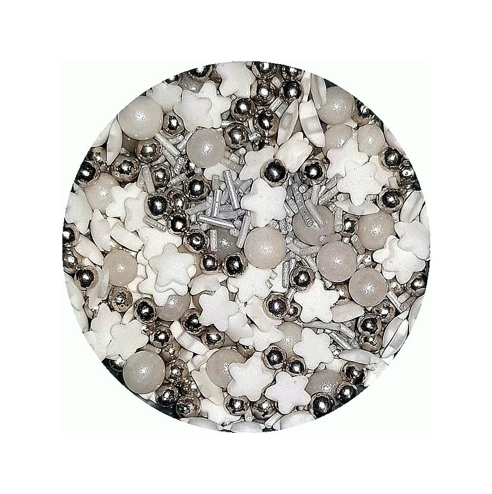 Fantastyczny mix srebrno-biały do udekorowania Państwa wypieków okolicznościowych lub świątecznych.