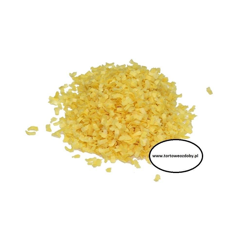 Posypka z wafla koloru żółtego to rewelacyjny a zarazem tani sposób ozdabiania tortów, ciast oraz deserów. Bardzo ładnie komponuje się z ciastem zachowując swoją strukturę. Takiego efektu nie jesteśmy w stanie uzyskać stosując inne posypki. Jeżeli chodzi o tort to fantastycznie on wygląda obsypany dookoła tą posypką. W przypadku koloru żółtego posypka może służyć jako inscenizacja piaskowej plaży na torcie. Posypka waflowa została zapakowana w wygodny woreczek foliowy. Cena dotyczy 1-ego opakowania 100g.