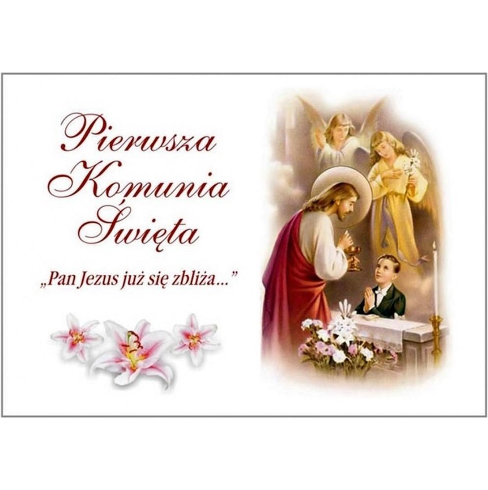 Jadalny wykonany z wafla prostokątny opłatek na tort komunijny Chłopiec. Nadruk na opłatku został wykonany za pomocą jadalnych atestowanych tuszy spożywczych. Wydruk został wykonany specjalistyczną drukarką. Kolorystyka opłatka może nieznacznie się różnić od projektu graficznego (kolor opłatka jest intensywniejszy po nałożeniu na masę).
