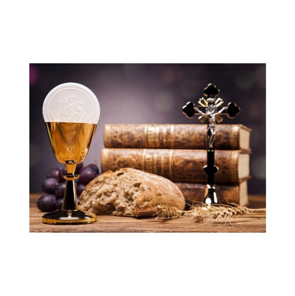 Jadalny wykonany z wafla prostokątny opłatek na tort komunijny Komunia Święta . Nadruk na opłatku został wykonany za pomocą jadalnych atestowanych tuszy spożywczych. Wydruk został wykonany specjalistyczną drukarką. Kolorystyka opłatka może nieznacznie się różnić od projektu graficznego (kolor opłatka jest intensywniejszy po nałożeniu na masę).