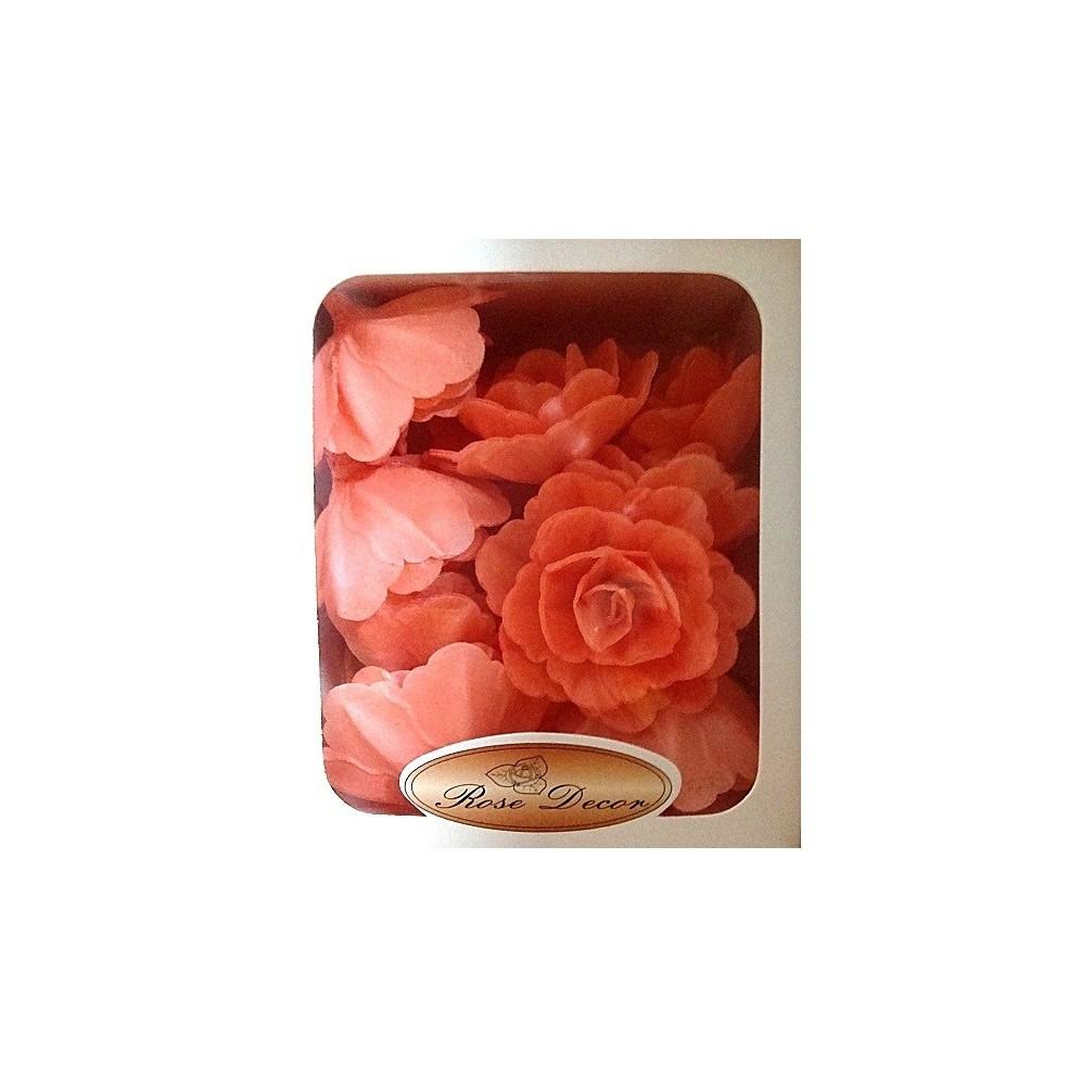 Wspaniała róża chińska koloru łososiowego to idealna dekoracja do tortów, ciast lub deserów. Te śliczne róże zostały wykonane z wafla i można je spożywać razem z wszelkimi pysznymi wypiekami. Główną zaletą róży chińskiej jest lekkość co daje możliwość układania jej na torcie w wielu kompozycjach bez znacznego naruszania jego wierzchu. Należy również dodać że mimo wykonania z wafla róża jest bardzo trwała i nie łatwo ulega zniszczeniu. Natomiast piękny kolor tego kwiatu został uzyskany dzięki dodaniu najlepszej jakości barwników spożywczych. Średnica jednej róży wynosi 5,5cm.