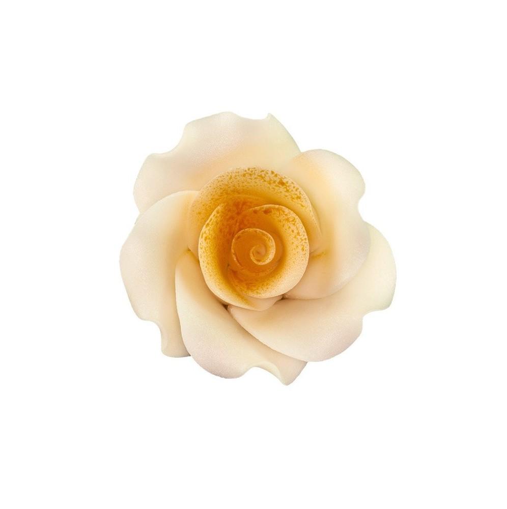Piękna róża XL koloru ecru (cieniowanego) to kwiat który w wyjątkowy sposób udekoruję Państwa tort urodzinowy. Róża została wykonana z pysznej i słodkiej masy cukrowej. Wyjątkowy kształt kwiatu oraz piękne kolory sprawiają iż róża wygląda jak żywa. Każda róża została ręcznie wykonana co świadczy o wysokiej jakości produktu. Rozmiar róży: średnica około 7cm, wysokość około 4cm. Róże sprzedawane są pojedynczo. Cena dotyczy 1-nej SZTUKI.
