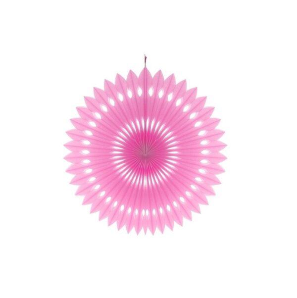 Rozkładana papierowa rozetka w kolorze jasnoróżowym, zdobiona ażurowym wykończeniem.