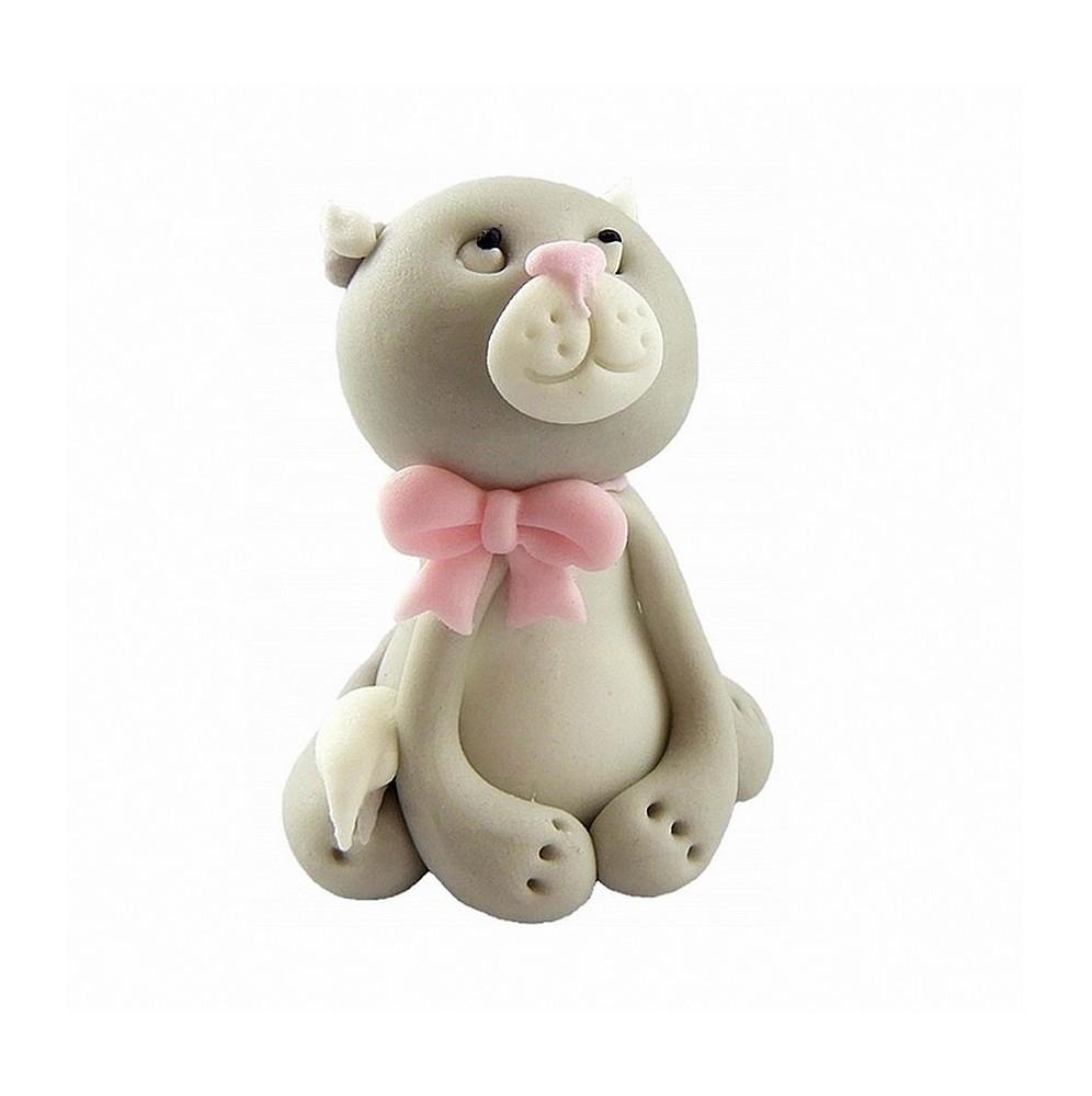 Siwy kot z kokardą to idealna dekoracja na tort dla twojego dziecka.