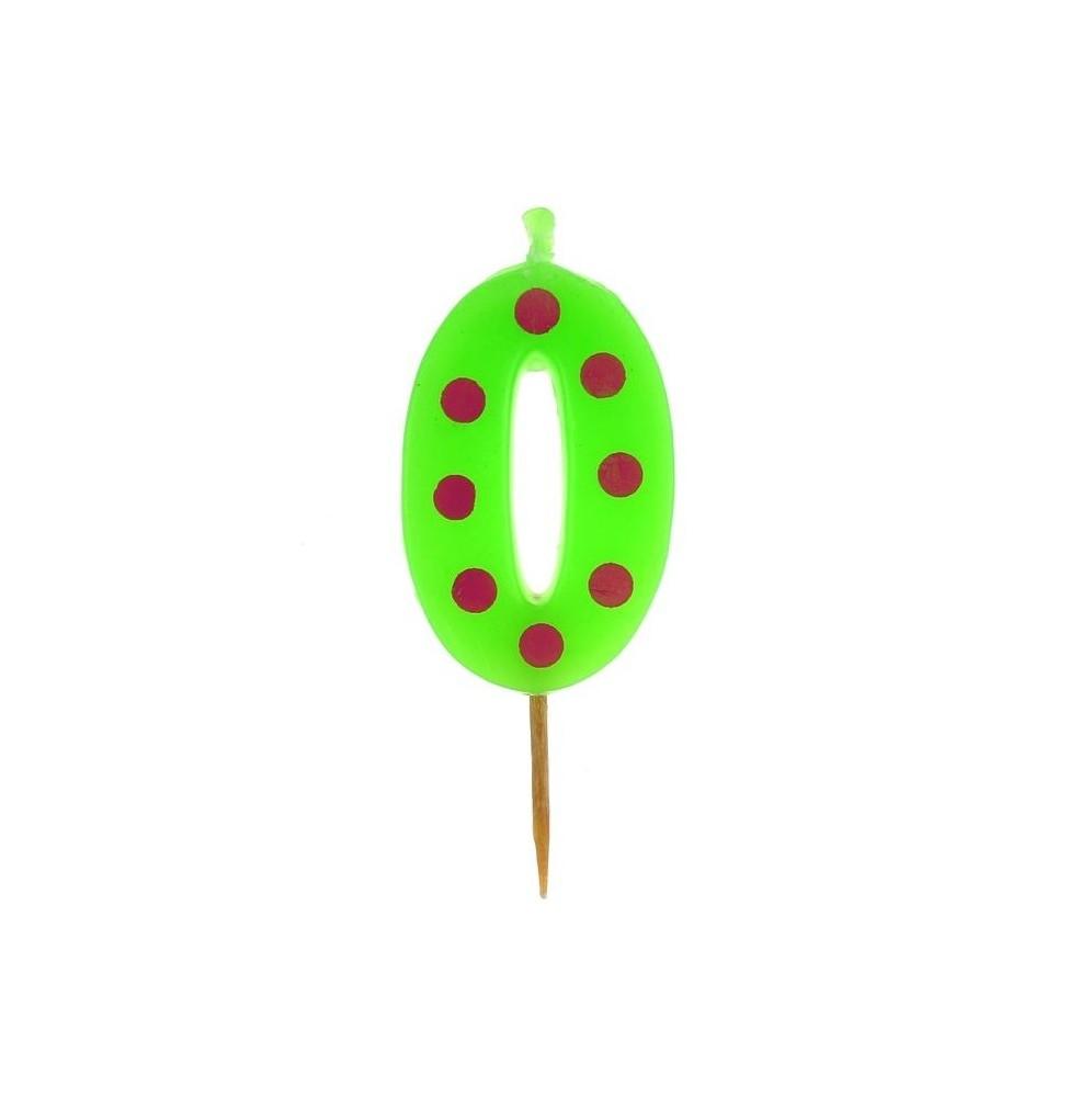 Świeczka w kolorze zielonym w fioletowe grochy – z cyfrą „0”