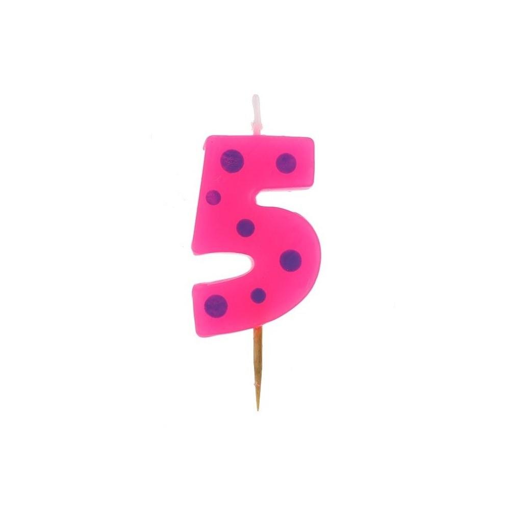 Świeczka w kolorze różowym w jasno-fioletowe grochy – z cyfrą „5”