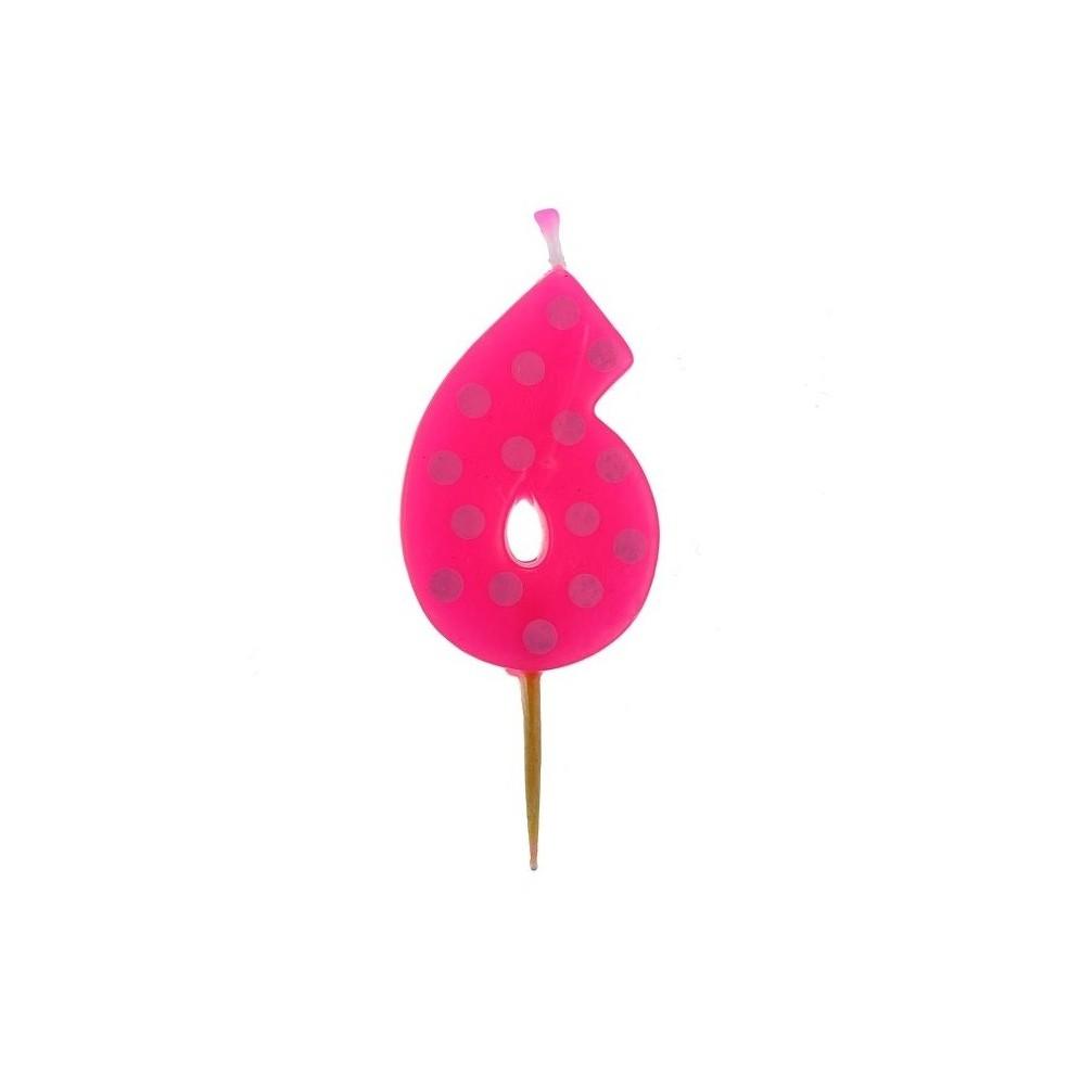 Świeczka w kolorze różowym w jasno-różowe grochy – z cyfrą „6”