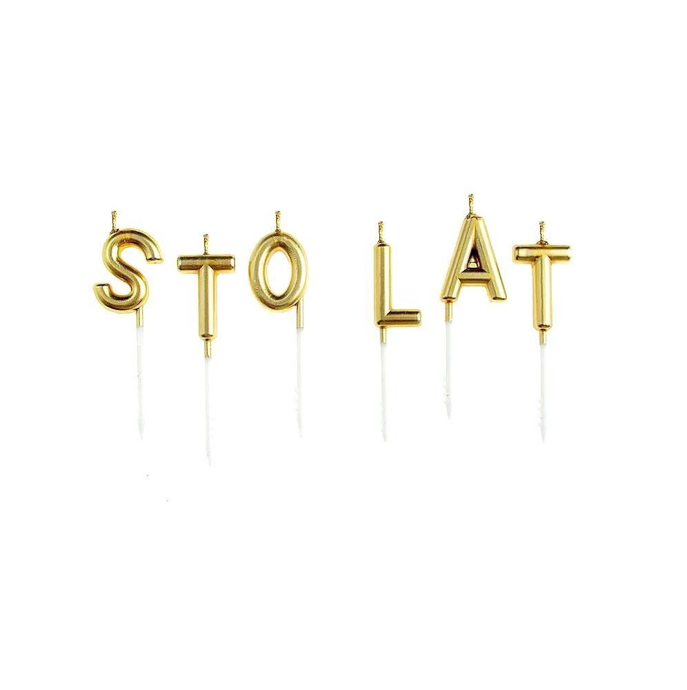 Fantastyczne świeczki koloru złotego z napisem Sto Lat.