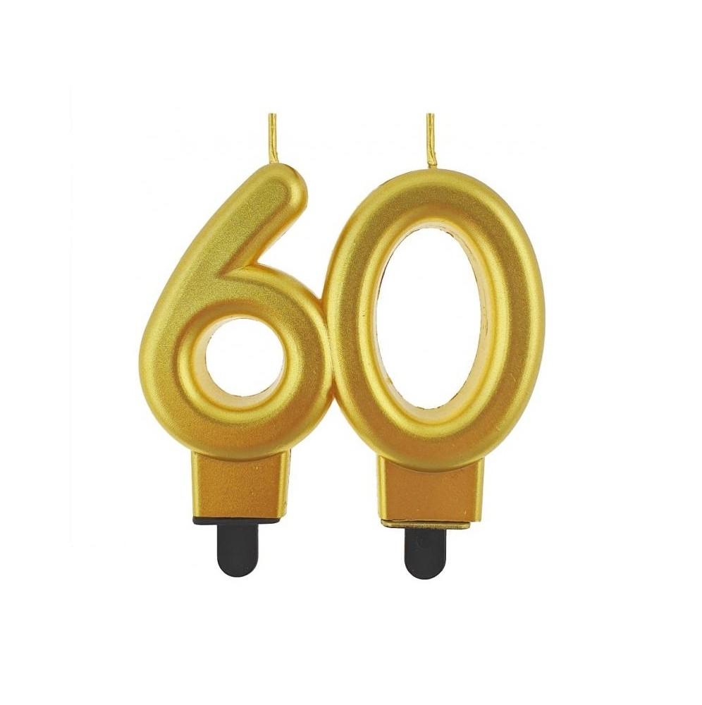 Piękne złote dwie świeczki połączone ze sobą w kształcie „60” to doskonała dekoracja każdego urodzinowego tortu z okazji tego ważnego wydarzenia.