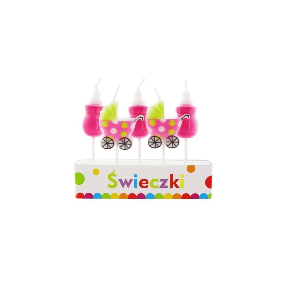 W zestawie mamy 2 świeczki w kształcie wózka oraz 3 świeczki w kształcie butelki ze smoczkiem.