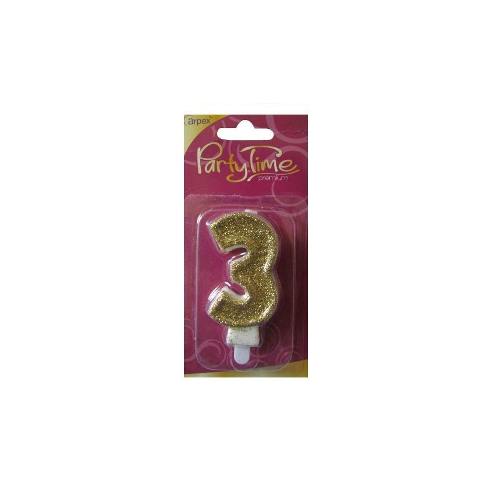 Doskonała świeczka urodzinowa w kształcie cyferki w złotym brokacie na każde przyjęcie urodzinowe.