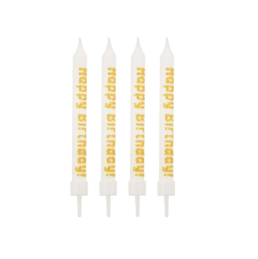 Białe urodzinowe świeczki na tort z brokatowym nadrukiem Happy Birthday. Odpal świeczki na torcie i rozpal emocje na urodzinach!