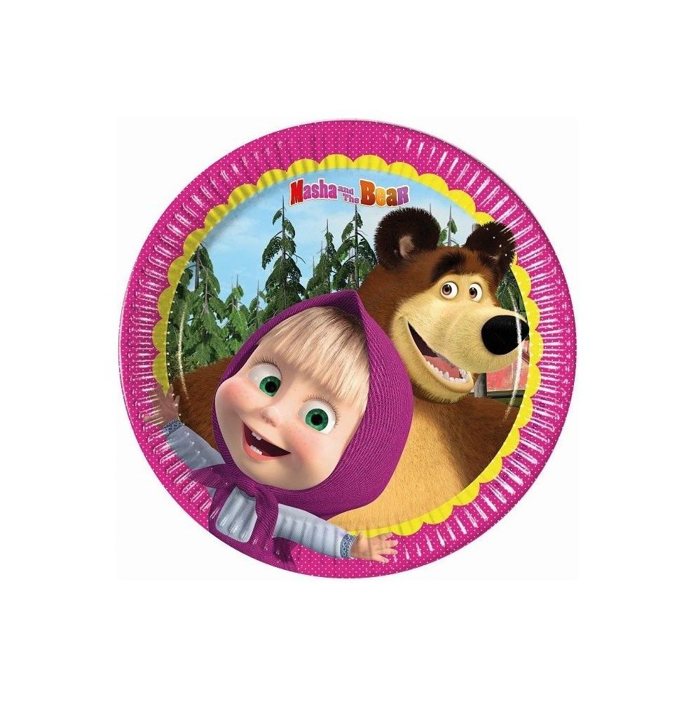 Niepowtarzalne jednorazowe talerzyki urodzinowe z motywem popularnej Mashy. Fantastyczny dodatek do imprezy urodzinowej dla Naszej małej pociechy.