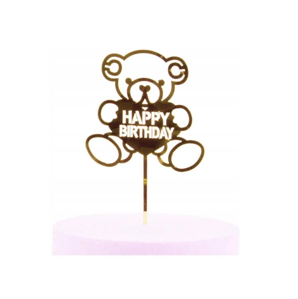 Doskonale prezentujący się akrylowy topper w kształcie misia z napisem happy birthday, idealny do ozdabiania przeróżnych słodkości