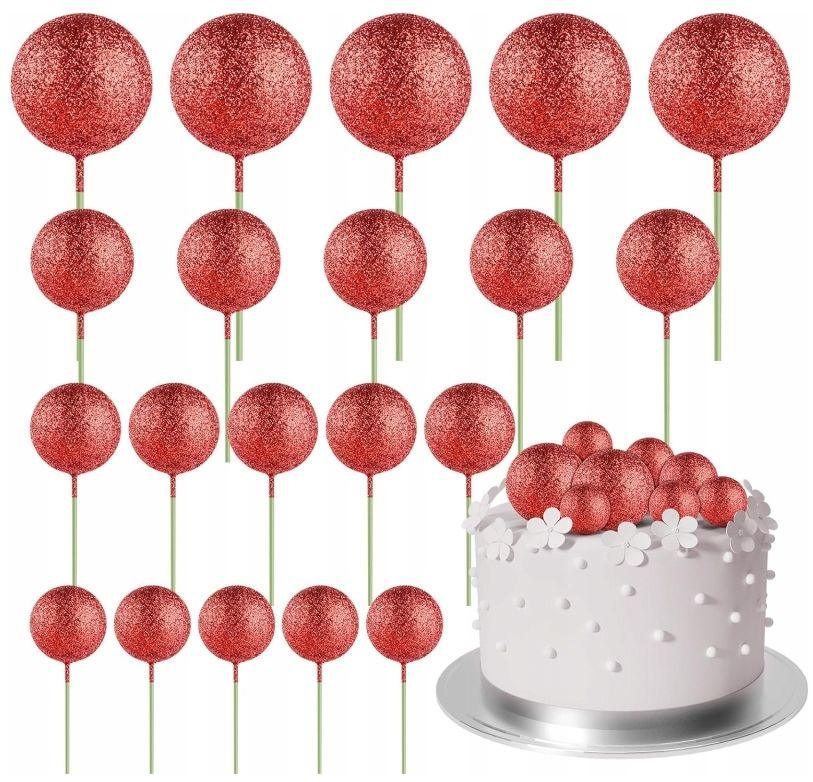 Zestaw topperów na tort Kule czerwone brokatowe na piku to dekoracja, która dodaje wypiekom odważnego i eleganckiego wyglądu. Intensywnie czerwony kolor w połączeniu z delikatnym brokatem tworzy efektowny akcent, który przyciąga wzrok.
