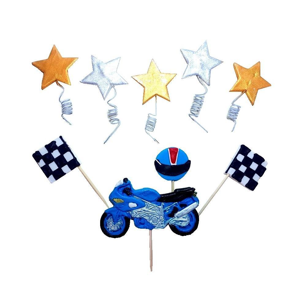 Fantastyczny zestaw topperów na tort z wizerunkiem motoru, kasku,flag oraz gwiazdek.