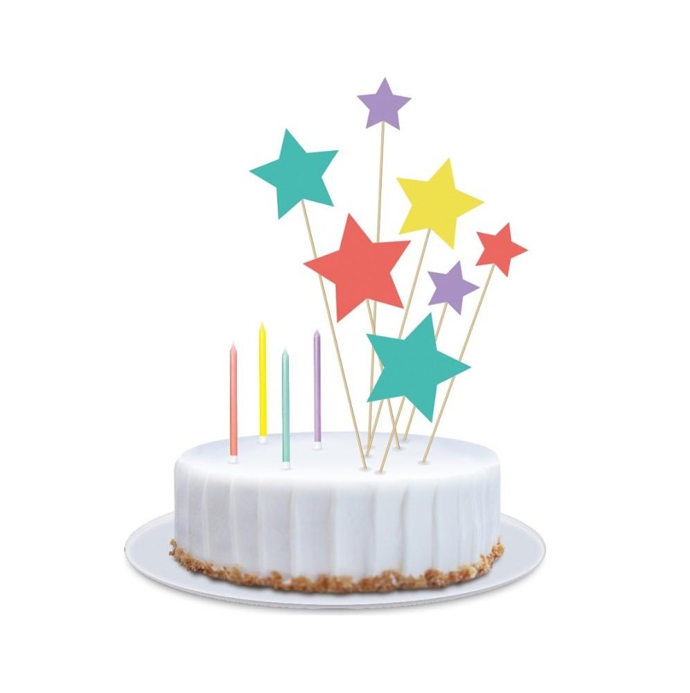 Pastelowa dekoracja na tort składająca się z 11 elementów: 4 x świeczki, 4 x pikery (18 cm) i 3 x pikery (13 cm).