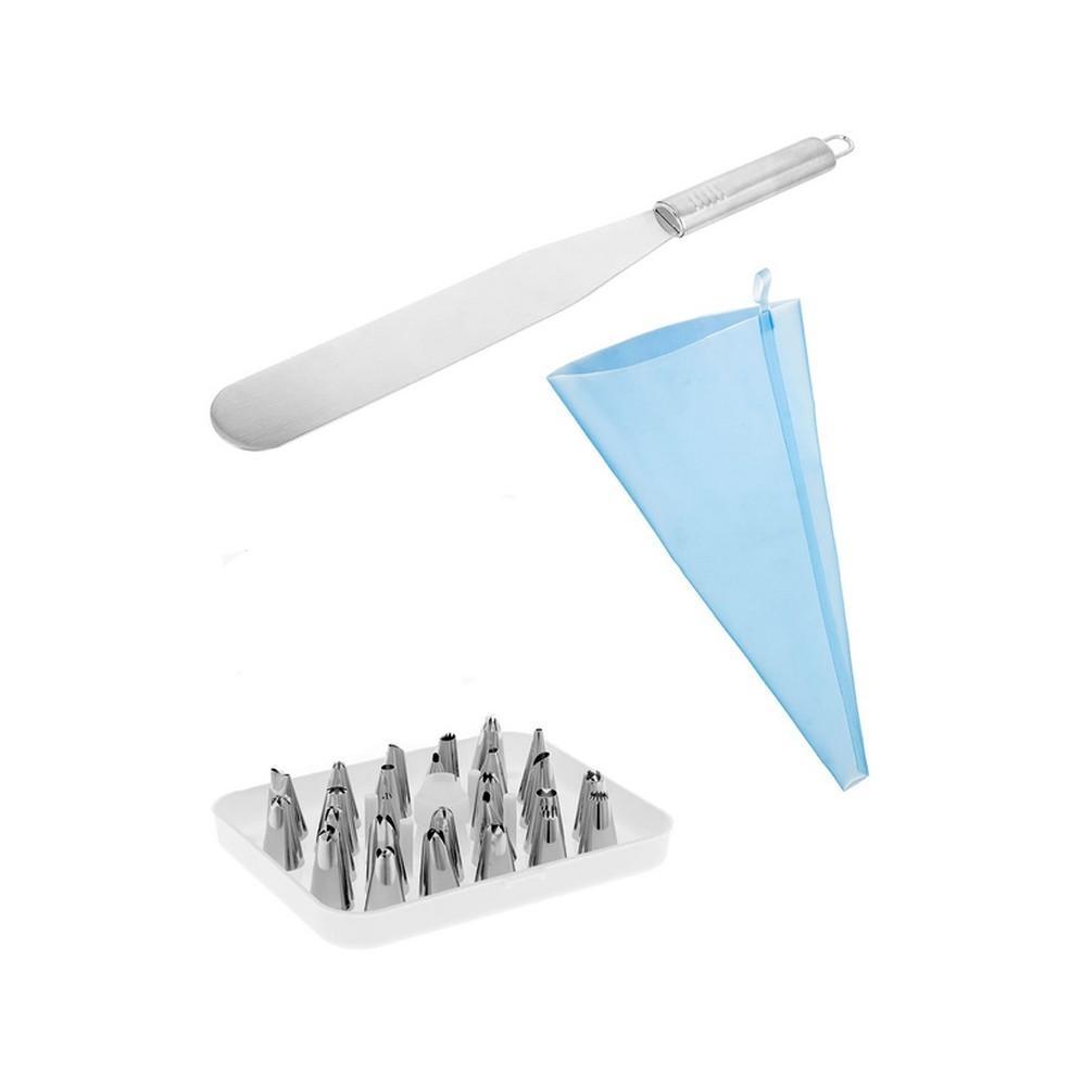 – Zestaw 26 końcówek do dekoracji z rękawem silikonowym i adapterem oraz szpatułą.