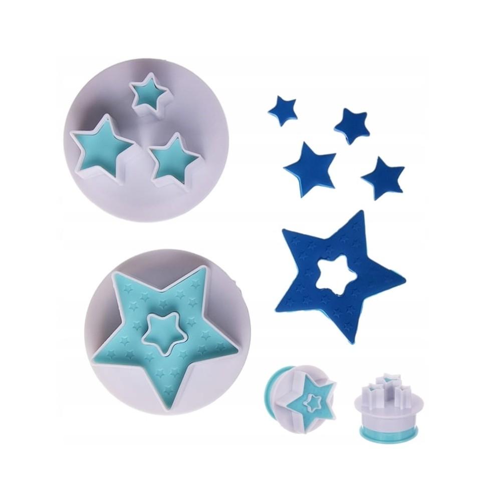Wykrawacze z tłoczkiem gwiazdki do wykonywania ozdób z masy cukrowej lub wykrawania piernikowych ciasteczek.