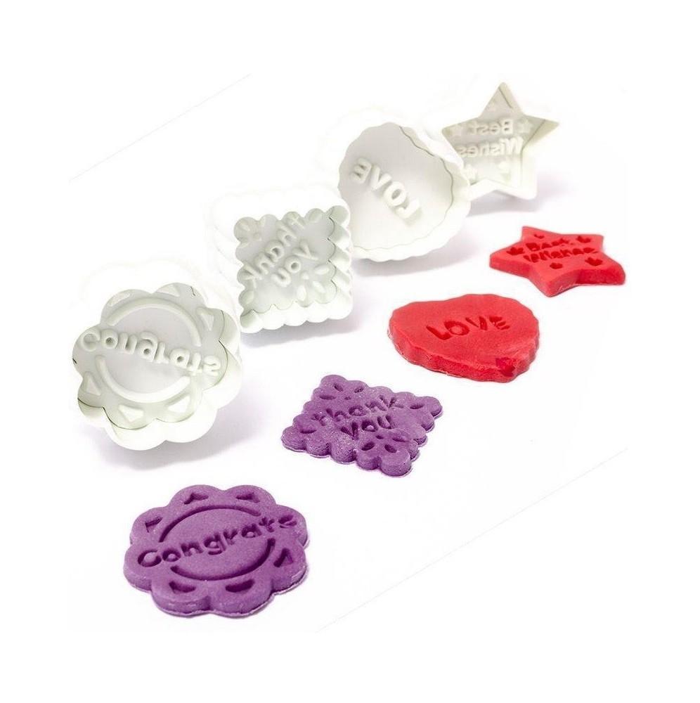 W zestawie 4 foremki z napisami : LOVE, THANK YOU, BEST WISHES,CONGRATS