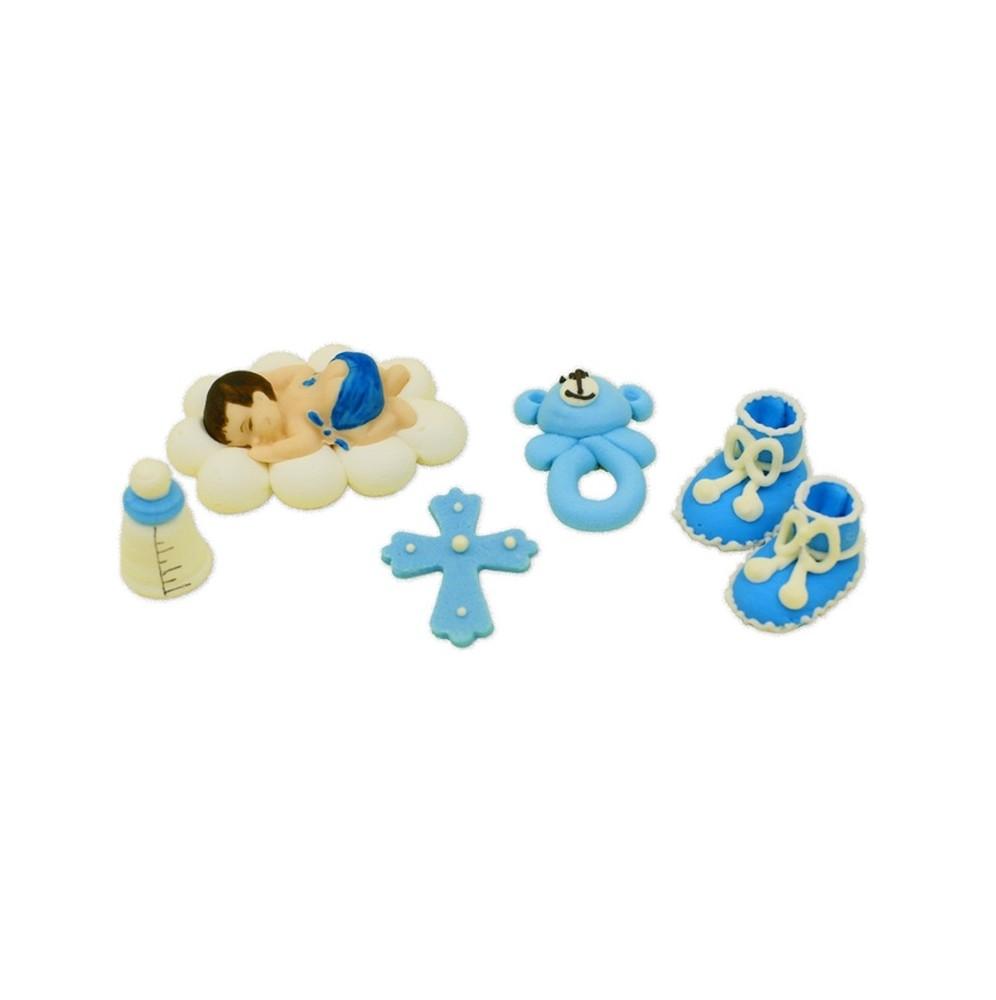 Zestaw figurek cukrowych w kształcie chłopczyka w łóżeczku wraz z akcesoriami, idealnie nada się do udekorowania małego i średniego tortu, oraz innych okazjonalnych wyrobów cukierniczych na przykład na chrzest.