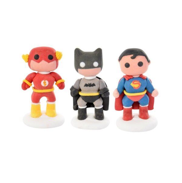 Fantastyczne figurki bajkowe wykonane z cukru w zestawie 3 superbohaterów: Batmana, Supermana oraz Flasha.
